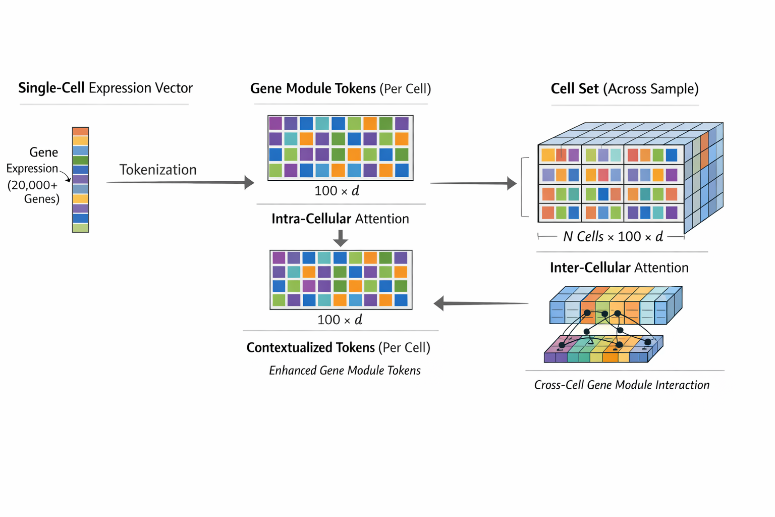 It tokenize gene expression vector (1 x p) each cell to “gene module tokens” (d x token_n) that capture coherent biological groupings.